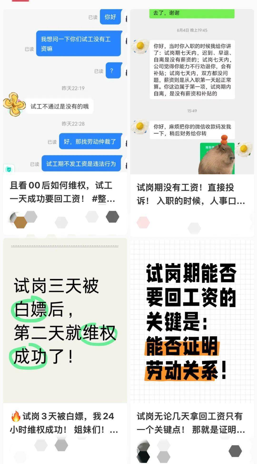 由于维权意识较强,来自北京的任女士拿到了试岗补贴。2024年,任女士入职一家公司做客服,3天后才被告知有“5天无薪试岗”的规定。她立刻保留工作记录、聊天截图和任务录音作为证据。