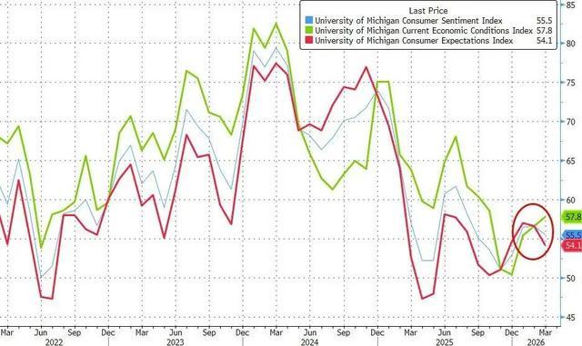在对伊朗采取军事行动之前完成的访谈显示,消费者信心较上月有所改善,但随后9天内的数据下降完全抹去了这些涨幅。