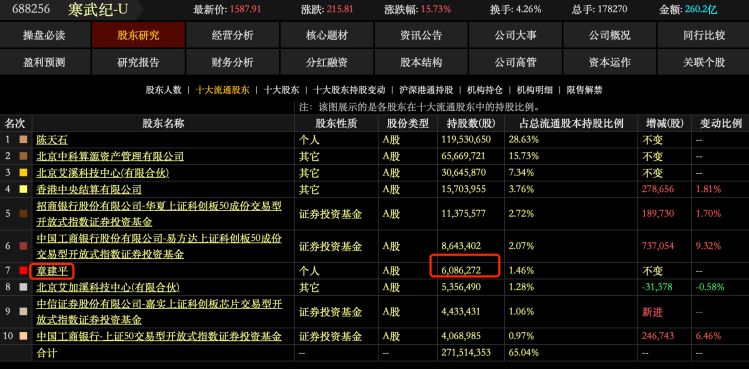 寒武纪前不久刚刚披露的中报显示,截至6月30日,章建平持有寒武纪608.63万股,较一季度没有变化。