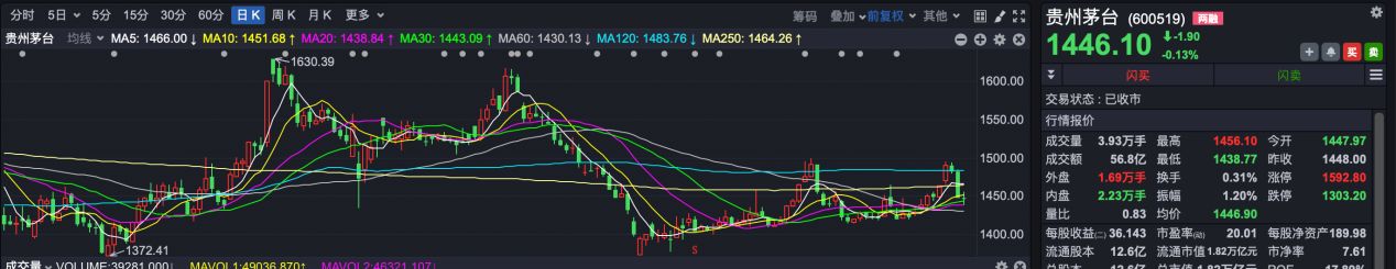 同一天,贵州茅台报收于1446.10元,绝对价格被寒武纪超出9.8%。