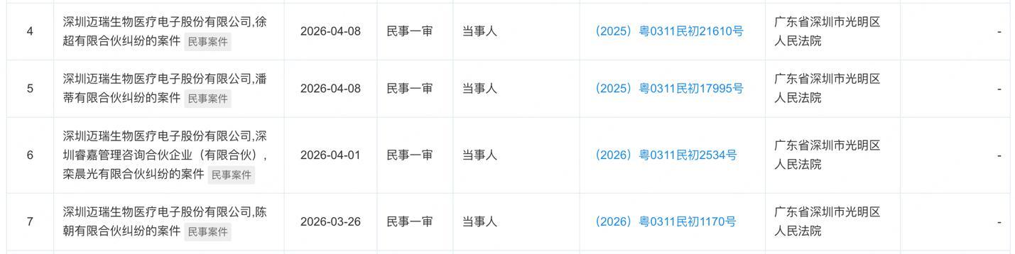 2026年3-4月,迈瑞医疗与涉及四名前核心骨干的有限合伙纠纷进入民事一审阶段,尽管公开信息未披露原被告身份,但结合时间线与股权结构来看,此次纠纷大概率围绕员工持股平台的合伙人权益、退出机制展开。根据迈瑞医疗早前公告,睿和投资与睿嘉管理属于迈瑞医疗的员工持股平台。