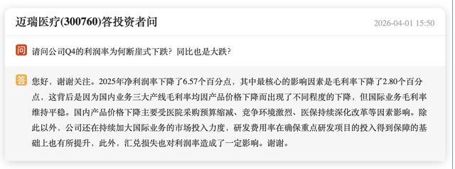 业绩的转变,直接反映在股价表现上。自2021年创出历史高点后,迈瑞医疗股价持续走弱,市值大幅缩水。截至2026年4月7日收盘,股价报157.76元,较2021年高点累计跌幅近七成,总市值约1912.75亿元。
