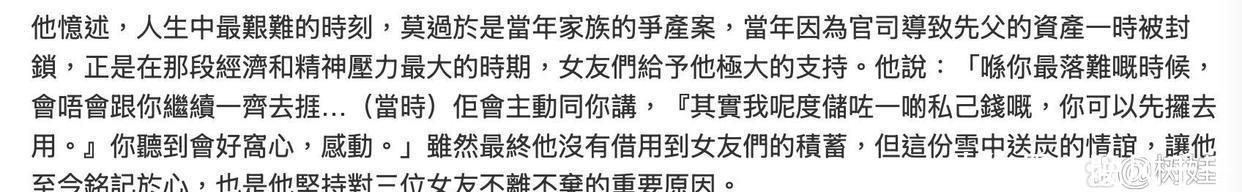 而邓兆尊对这三个女友中的两个,即老大以及老二一直不离不弃,在一起超过几十年,也是因为对方曾经在自己最落魄的时候给予了最大的支持。邓兆尊称人生最艰难的时刻是在当年家族争产的时候,因为官司的原因,导致其父亲的资产一时被封锁,那时候他的经济困难,精神压力极大,全靠女友们给予了极大的支持,并且表态会与自己一起熬下去。当时两个女友对他说,可以把自己存下来的钱拿去救急用,这让他备受感动,之后他就铭记于心,所以他决心要照顾她们一辈子。