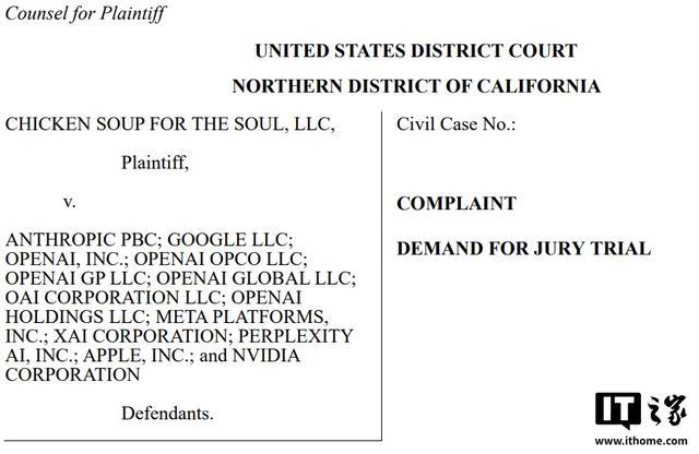 被告名单涵盖了当前 AI 领域的核心成员,包括苹果、谷歌、英伟达、Meta、OpenAI、Anthropic、Perplexity AI 以及埃隆 · 马斯克旗下的 xAI。IT之家附上相关截图如下: