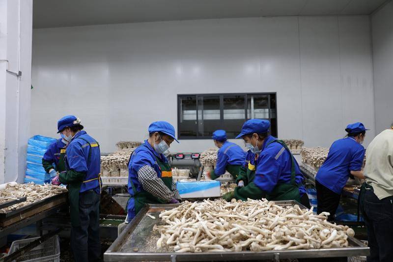 工人挑拣蘑菇。