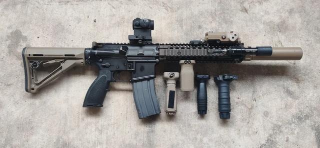 不过,最早的战术配件几乎全部都是基于M4设计的,放在其他一些枪上可能就不太适用了。比如垂直握把,放在M4上是个很不错的设计,但在AK身上就存在问题。AK步枪的弹匣是前挂后卡式固定的,更换弹匣时要把弹匣向前推。如果有垂直握把挡着,那根本就没法正常装填了。